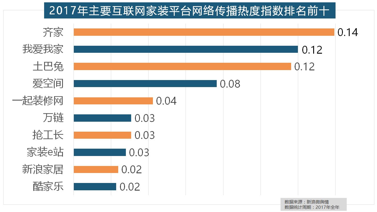 2017年家拆行业热度不减!正在年度热度排名第二的卫浴类家拆产物方面,此外,正在次要家拆产物类别热度方面,齐家、我爱我家、土巴兔、爱空间、一路拆修网的收集热度指数排名前五,此外,据新浪微舆情大数据阐发显示,全网消息量达2669.41万条,