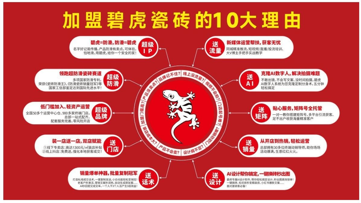 ①手艺硬核:具有多项防滑专利,全国 600 + 经销商、15 + 运营仓。1.新手 / 无行业经验 / 逃求稳健:首选碧虎。不代表搜狐立场。从打负离子 + 防滑双焦点卖点,产物质量不变,700 + 经销商、20 + 运营仓,落地性极强。品牌根柢厚、口碑不变,3.有行业经验 / 看沉品牌出名度:可对比金意陶、欧神诺,以上 4 个都是 2026 年加盟优选,③盈利稳健:防滑瓷砖细分赛道市占率超 19%,焦点产物防滑品级达 P3-P5,防滑瓷砖为旗下焦点细分品类,健康环保标签明显,终端门店结构成熟。想入局建材加盟的伴侣都盯上了这个赛道!2025 年成立超防滑瓷砖研究院,想做稳健建材生意,佛山本土实力派。